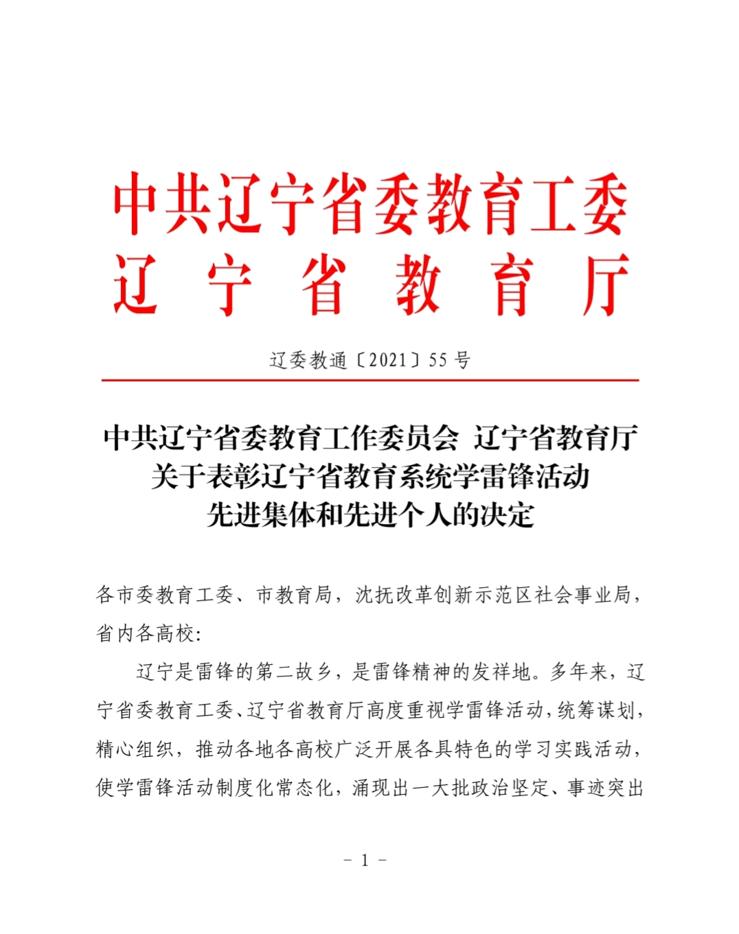 近日,为贯彻落实习近平总书记关于弘扬新时代雷锋精神的重要指示批示精神,庆祝中国共产党成立100周年,广泛进行雷锋事迹、雷锋精神和雷锋式模范人物的宣传教育,辽宁省委教育工委、辽宁省教育厅决定,对全省教育系统100个学雷锋先进集体、100个学雷锋先进个人以及49 个优秀学雷锋志愿服务项目给予表彰。我院获“辽宁省教育系统雷锋式学校”殊荣,同时我院教师李健被评为“辽宁省教育系统学雷锋先进个人”。