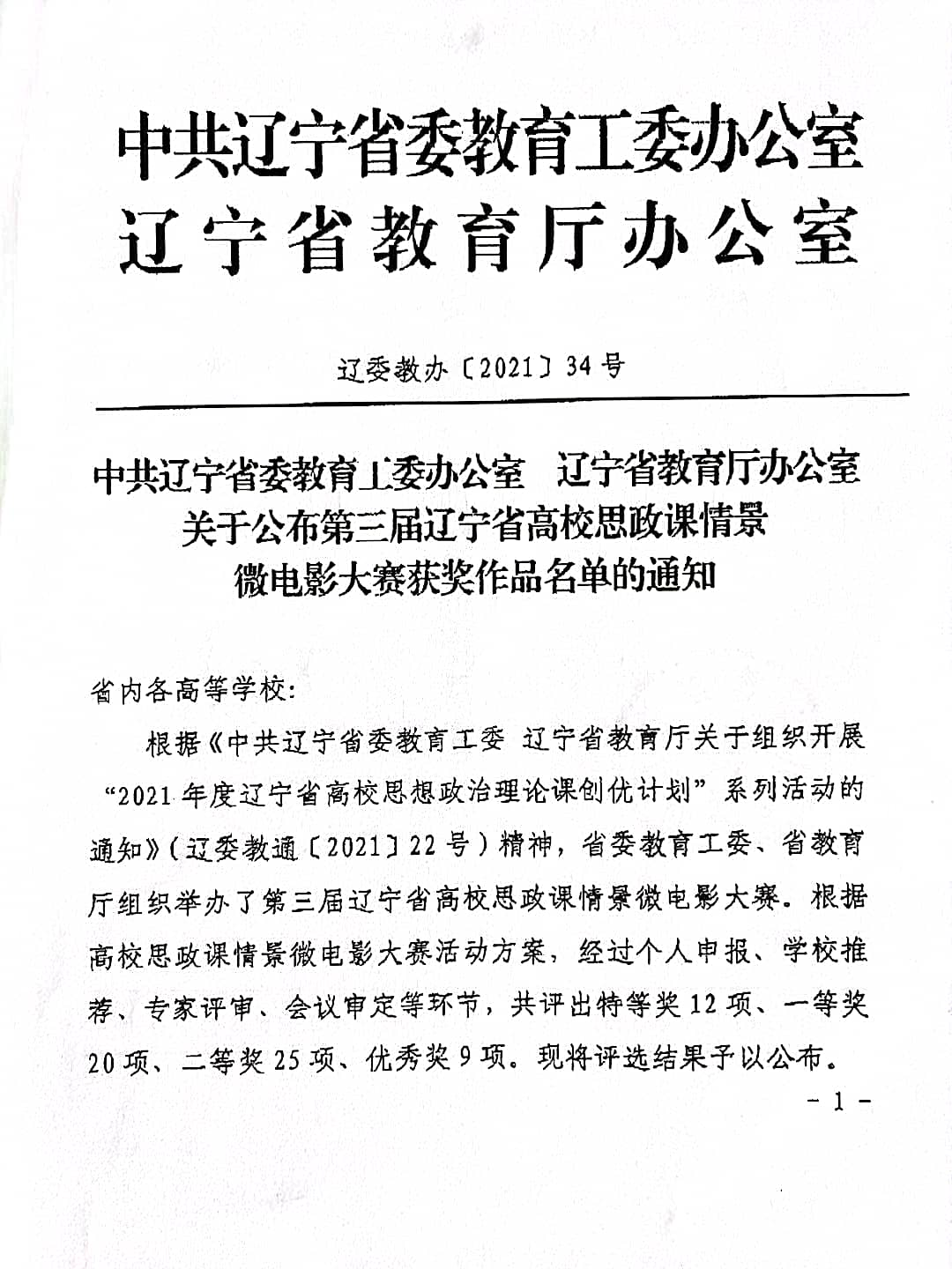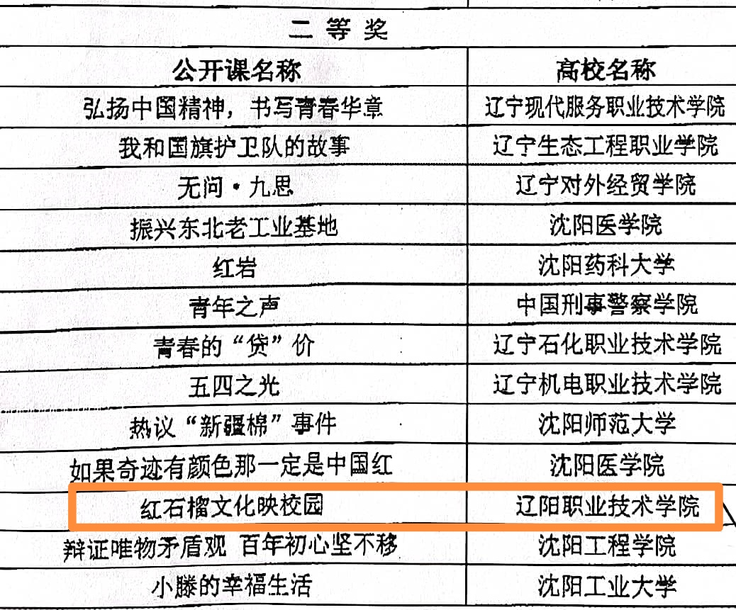 近日,中共辽宁省委教育工委办公室、辽宁省教育厅办公室发布《中共辽宁省委教育工委办公室 辽宁省教育厅办公室关于公布第三届辽宁省高校思政课情景微电影大赛获奖作品名单的通知》(辽委教办〔2021〕34号)。根据《中共辽宁省委教育工委 辽宁省教育厅关于组织开展“2021年度辽宁省高校思想政治理论课创优计划”系列活动的通知》(辽委教通〔2021〕22号)精神,省委教育工委、省教育厅组织举办了第三届辽宁省高校思政课情景微电影大赛。根据高校思政课情景微电影大赛活动方案,经过个人申报、学校推荐、专家评审、会议审定等环节,我院参赛作品《红石榴文化映校园》获第三届辽宁省高校思政课情景微电影大赛二等奖。