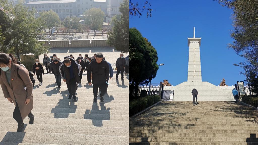 拾阶而上,绿树丛荫下是高高耸立的抗美援朝纪念塔,它是整个纪念馆的标志性建筑,站立台阶上仰头凝目注视,蓝天白云下是那般耀眼夺目且庄严肃穆!台阶为1014块条石砌成,寓意着中国人民志愿军战士在朝鲜奋战的1014个日日夜夜。