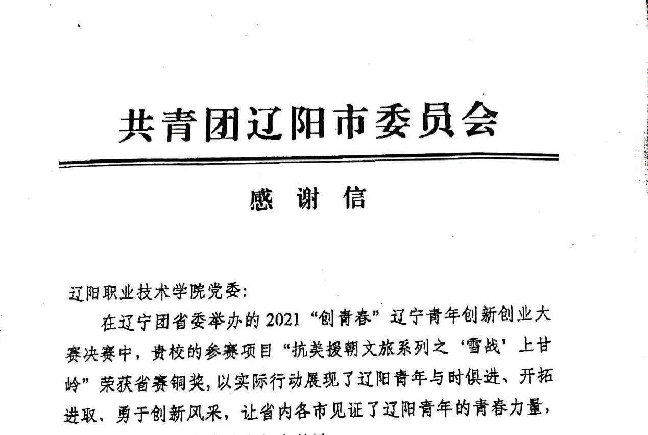 在辽宁团省委举办的2021“创青春”辽宁青年创新创业大赛决赛中,贵校的参赛项目“抗美援朝文旅系列之'雪战’上甘岭”荣获省赛铜奖,以实际行动展现了辽阳青年与时俱进、开拓进取、勇于创新风采,让省内各市见证了辽阳青年的青春力量,对贵校团委工作给予表扬和鼓励.