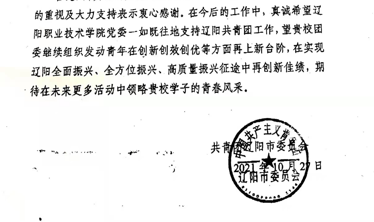 在此,向贵校党委对辽阳共青团工作和青年学生教育工作的重视及大力支持表示衷心感谢。在今后的工作中,真诚希望澳门新浦京3189娱乐场党委一如既往地支持辽阳共青团工作,望贵校团委继续组织发动青年在创新创效创优等方面再上新台阶,在实现辽阳全面振兴、全方位振兴、高质量振兴征途中再创新佳绩,期待在未来更多活动中领略贵校学子的青春风采。