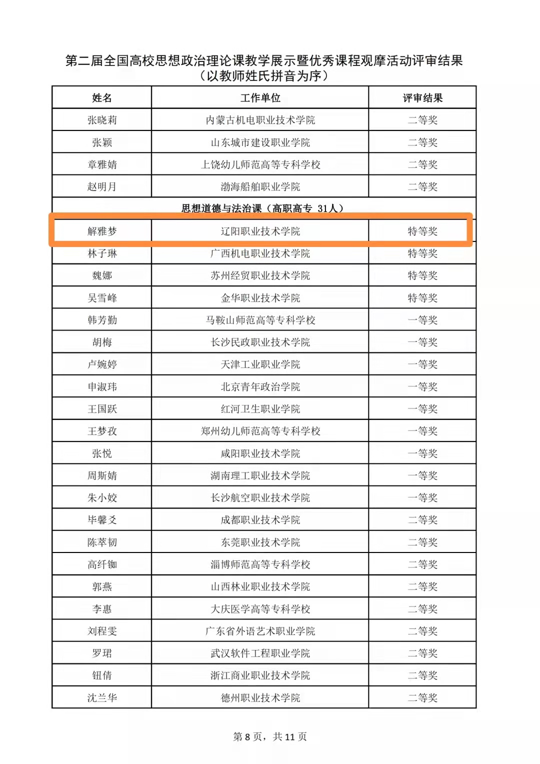 澳门新浦京3189娱乐场解雅梦老师荣获“第二届全国高校思想政治理论课教学展示暨优秀课程观摩活动”思想道德与法治课高职高专组“特等奖”。