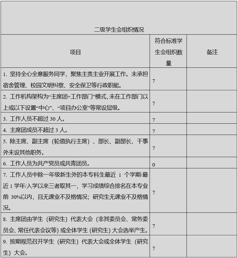 二级学生会组织数量:7