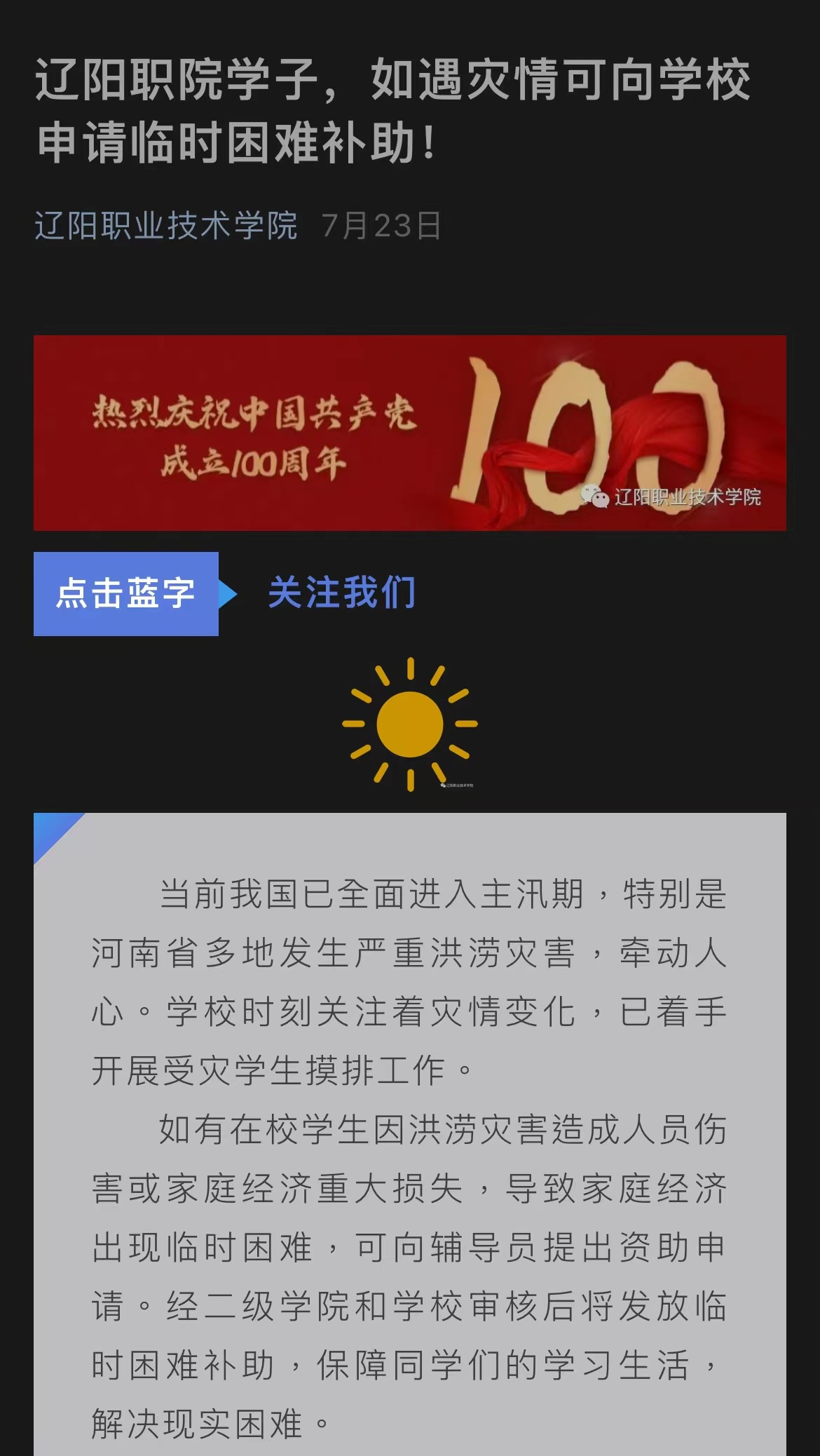澳门新浦京3189娱乐场党委高度重视学生资助工作,始终坚持以“精准资助”为主线,以“资助育人”为抓手,改革创新,求真务实,全面落实学生资助方面的各项政策,从未有一个孩子因家庭经济困难而失学。在2021年,针对我校贫困学生实际需求,院党委制定了《澳门新浦京3189娱乐场贫困学生资助管理办法(试行)》辽职院委发【2021】16号,落实每年从事业收入中足额提取5%的经费用于资助学生,为困难学生资助工作指定资助依据。在今年7月,河南多地发生严重洪涝灾害,我校党委及时响应,第一时间启动申请通道,为9名受灾的贫困学生申请到共计1.8万元的临时性困难补助,切实为困难学生带去关心和温暖。