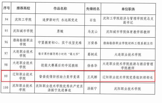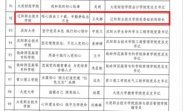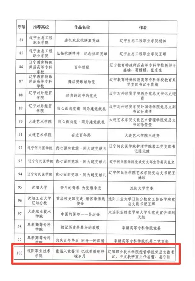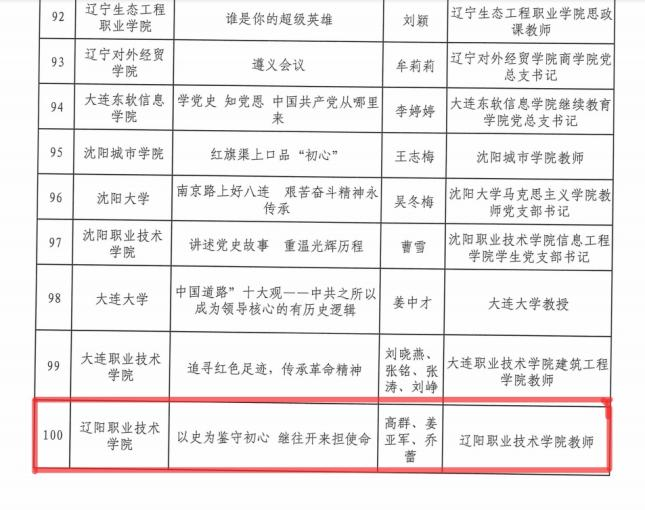 为庆祝中国共产党成立100周年,推进党史学习教育走深走实,根据省委党史学习教育领导小组办公室《关于在全省党史学习教育中开展“五个一百”活动的方案的通知》(辽学组办发[2021]19号)要求,省委教育工委组织全省高校开展了“百名书记谈初心、百名先锋话使命、百个支部展风采、百堂精品党课、百集微视频教育片”系列活动(简称“五个一百”活动)。经各高校申报、专家评审、网络公示,五个项目各评选出100个作品。我院申报的四个作品分别入围了全省高校“百名书记谈初心”、“百名先锋话使命”、“百堂精品党课”、“百集微视频教育片”名单。
