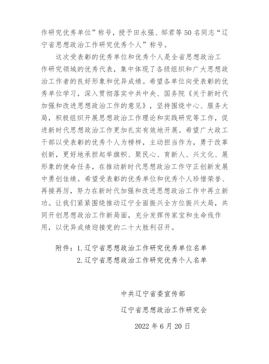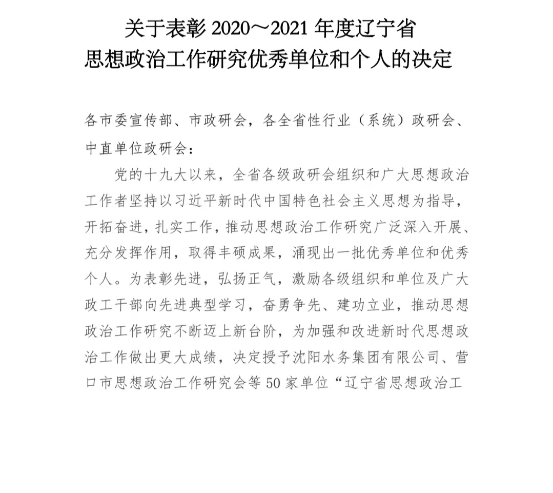 党的十九大以来,全省各级政研会组织和广大思想政治工作者坚持以习近平新时代中国特色社会主义思想为指导,开拓奋进,扎实工作,推动思想政治工作研究广泛深入开展、充分发挥作用,取得丰硕成果,涌现出一批优秀单位和优秀个人。为表彰先进,弘扬正气,激励各级组织和单位及广大政工干部向先进典型学习,奋勇争先、建功立业,推动思想政治工作研究不断迈上新台阶,为加强和改进新时代思想政治工作做出更大成绩,决定表彰优秀单位和优秀个人。澳门新浦京3189娱乐场在此次表彰中荣获“辽宁省思想政治工作研究优秀单位”称号。