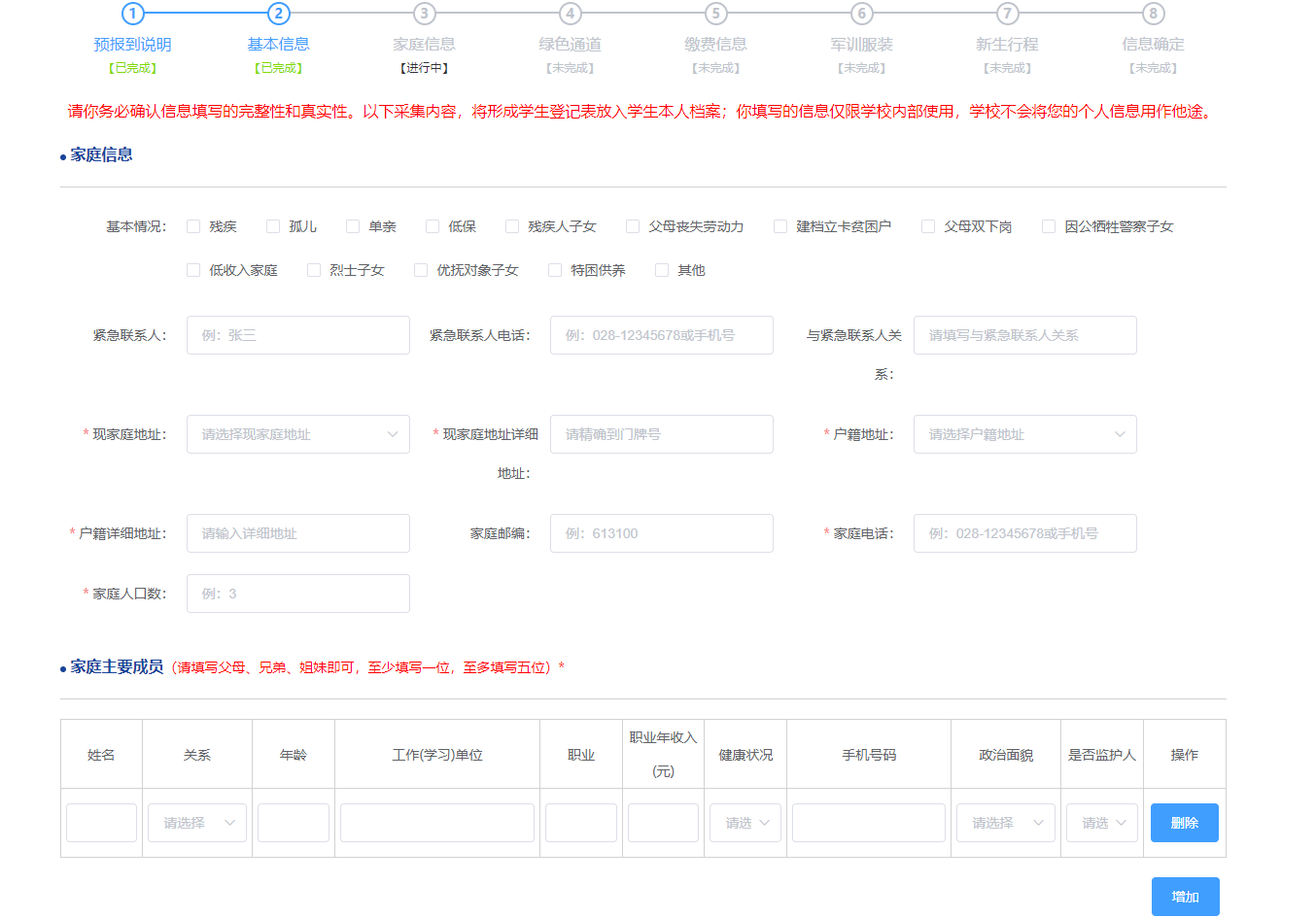 家庭信息登记页面,由学生填写家庭基本信息,按照提示填写即可。