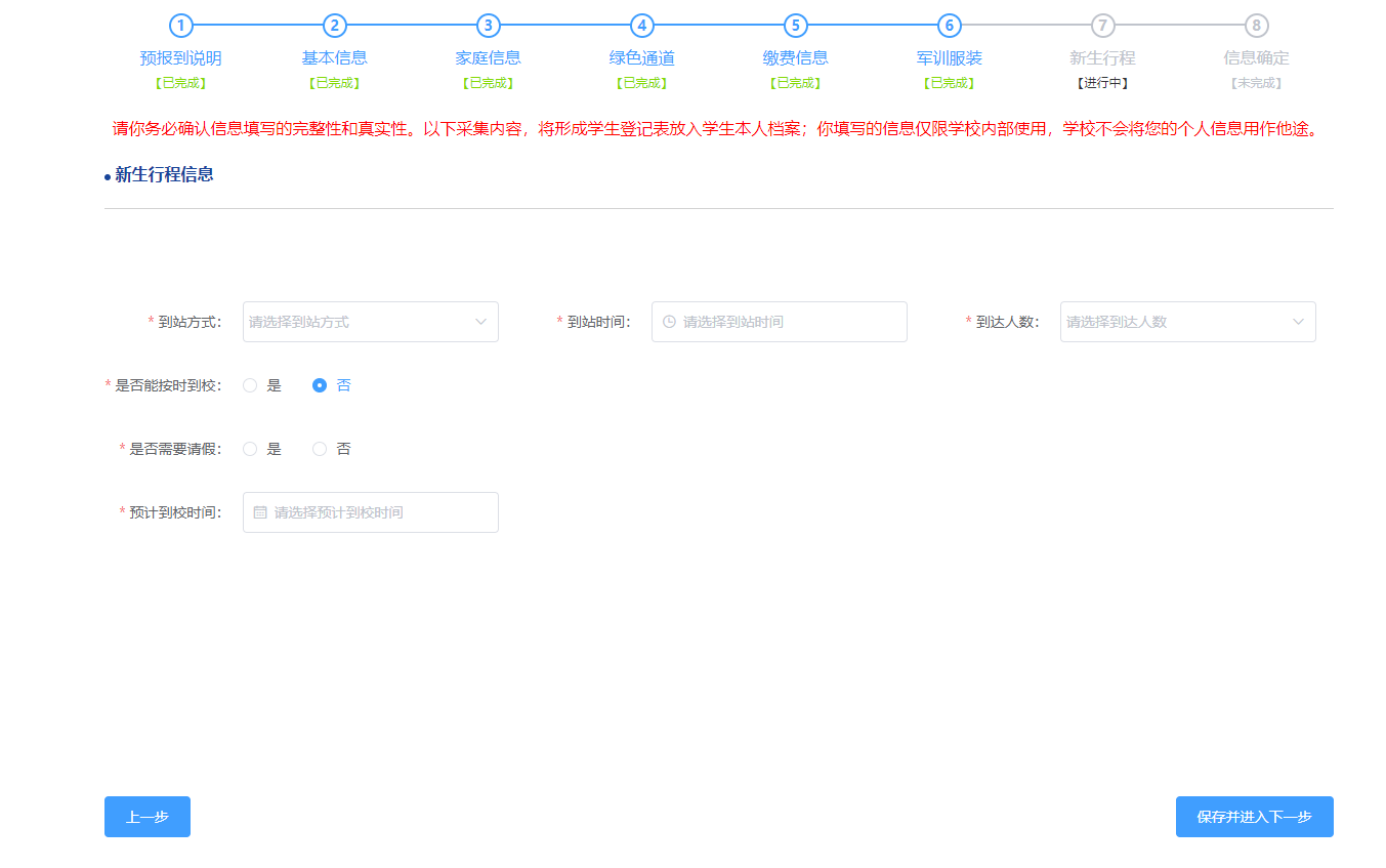 学生第一次登录时逐步进行确认招生录取信息、缴费信息查看、个人信息登记、家庭信息登记、绿色通道登记、其他信息登记、信息确认完成。点击提交,提交完成后会弹出预报到成功。