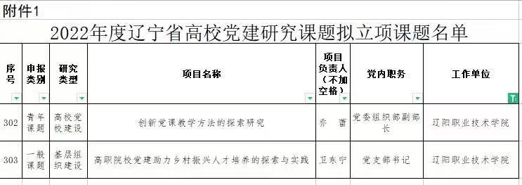 近日,中共辽宁省委教育工作委员会公布了2021年度辽宁省高校党建研究课题拟结项课题名单和2022年度辽宁省高校党建研究课题拟立项课题名单。我校有两项课题顺利结题,分别是由佟书、解雅梦等2位老师担任主持人,其中由佟书主持的课题《红色资源融入高职院校学生党建工作的研究与实践》评审结果为优秀。另有两项课题获得立项,分别是由乔蕾担任主持人的青年课题和卫东宁担任主持人的一般课题。