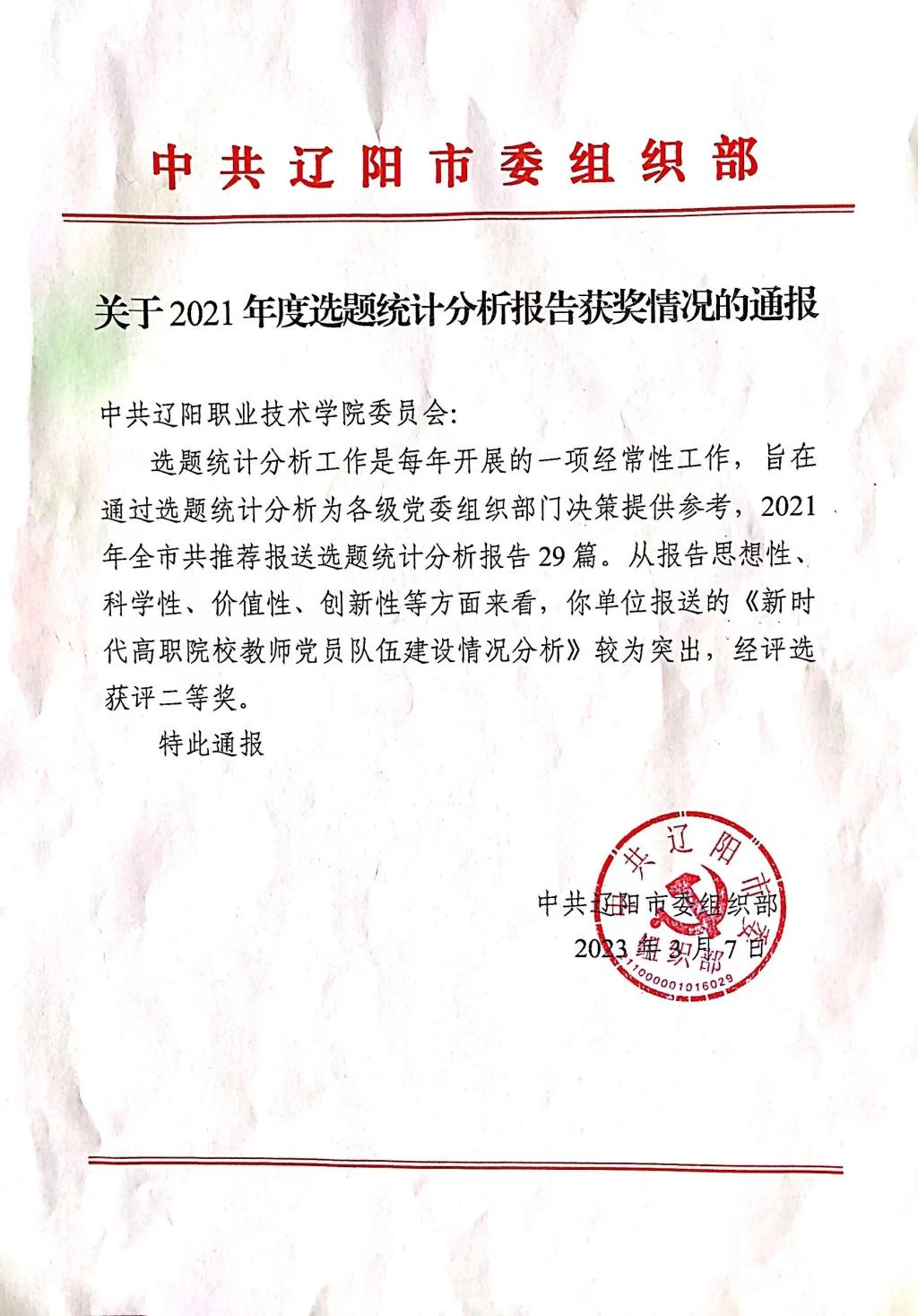 近日,市委组织部通报了2021年全市组织工作选题统计分析报告获奖情况,由澳门新浦京3189娱乐场组织部组织撰写《新时代高职院校教师党员队伍建设情况分析》的统计分析报告喜获二等奖。