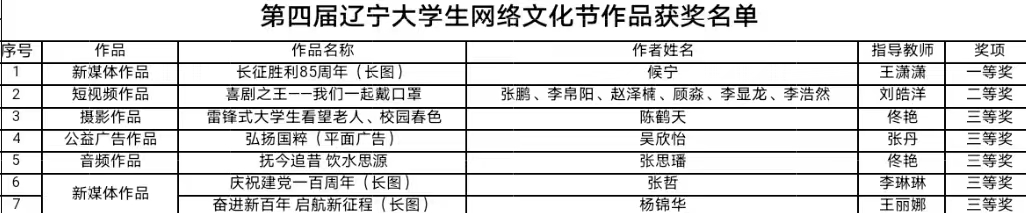近日,由中共辽宁省委教育工作委员会、辽宁省教育厅举办的第四届辽宁省大学生网络文化节和全省高校网络教育优秀作品推选展示活动落下帷幕,我院组织师生积极参与,取得一等奖1项、二等奖 1 项、三等奖 8 项的可喜成绩。