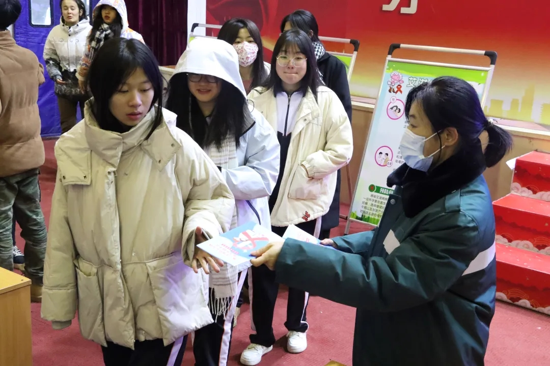 卫生所所长王丽新为到场学生分发防艾知识手册。