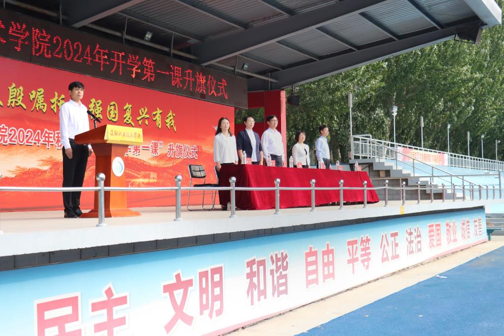 清风送夏远,舒云卷秋来。秋光为序,逐梦启航。9月9日,我院在田径场举行“牢记殷殷嘱托 强国复兴有我”2024年秋季学期开学第一课升旗仪式。院党委书记杨延斌,党委副书记、院长陈丽,副院长衣颖、张彬、赵冲、李健出席仪式。仪式由李健主持。