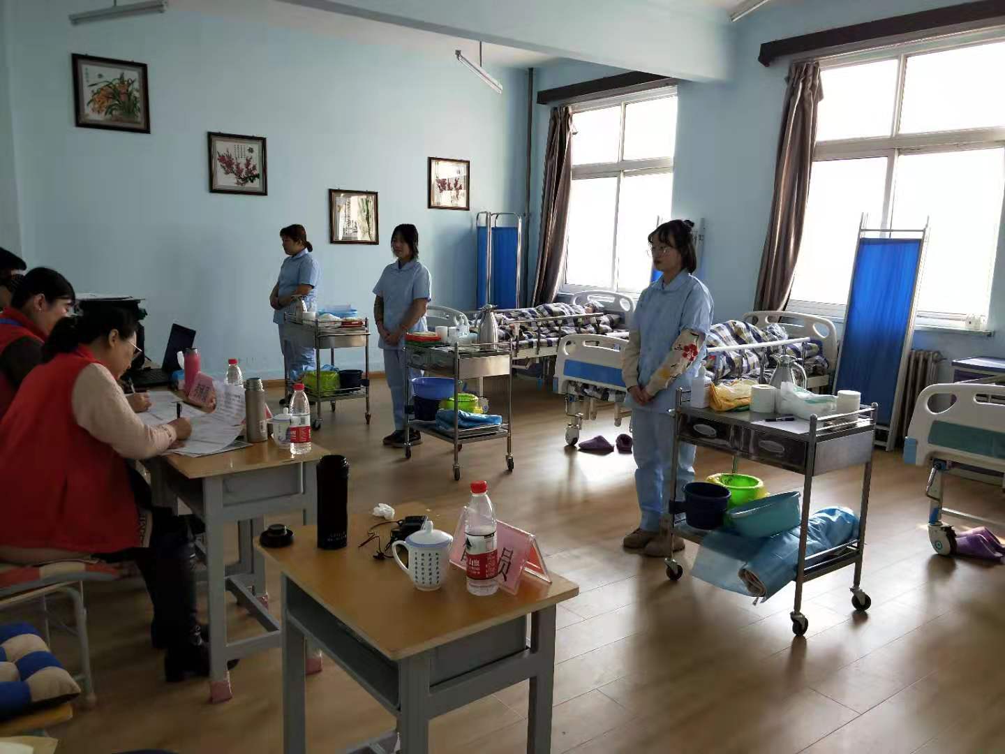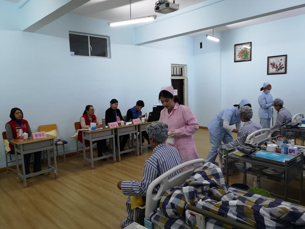 考题由考评专家组组长在开考前30分钟随机线上抽取,两天4个考场分别进行了测量体温、帮助如厕、助行器训练,恐惧跌倒心理应对;纸尿裤更换、手臂红肿进行湿热敷处理、手掌烫伤、纸尿裤自卑心理应对;床上使用便器、衣物更换、压疮的预防、无法自主穿衣情绪低落心理应对等实操考试。