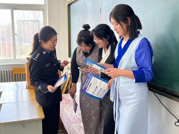 刑侦大队民警给同学们发宣传单,并交流分享电信诈骗真实案例,提醒同学们在接到陌生来电一定要注意防范,谨防被骗。如遇到冒充派出所等工作人员来电时,应去公安局核实,切勿盲目汇款,造成巨大损失。