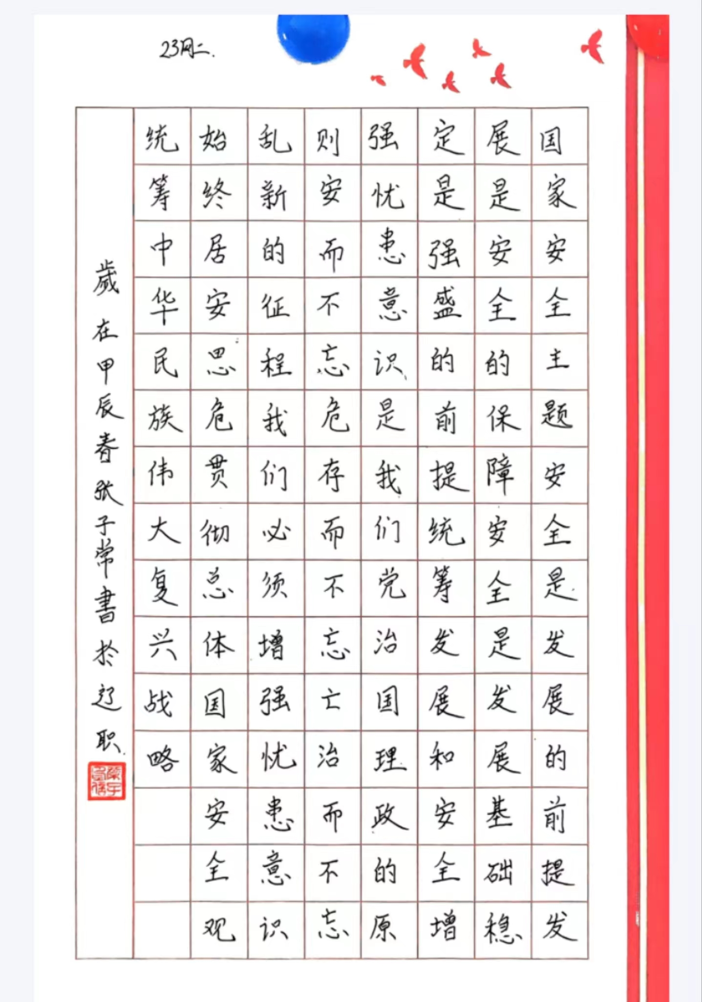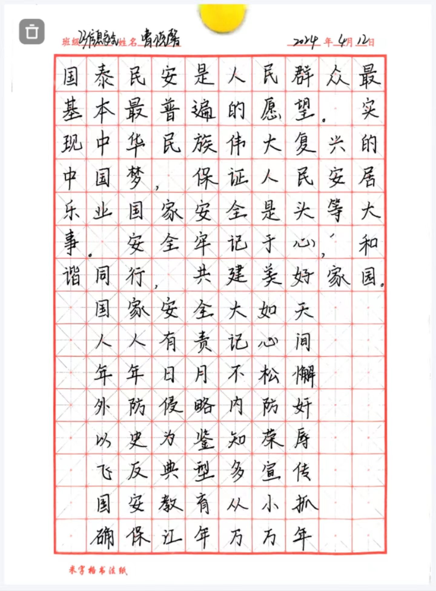 国家安全,你我共筑。2024年是习近平总书记提出总体国家安全观10周年,4月15日是第9个全民国家安全教育日。为了让学生积极主动了解国家安全的有关法律、法规,进一步增强法律意识和国家安全意识,增强维护国家安全的责任感、义务感和荣誉感,信息工程学院于4月15日举办国家安全教育书法美术作品大赛。