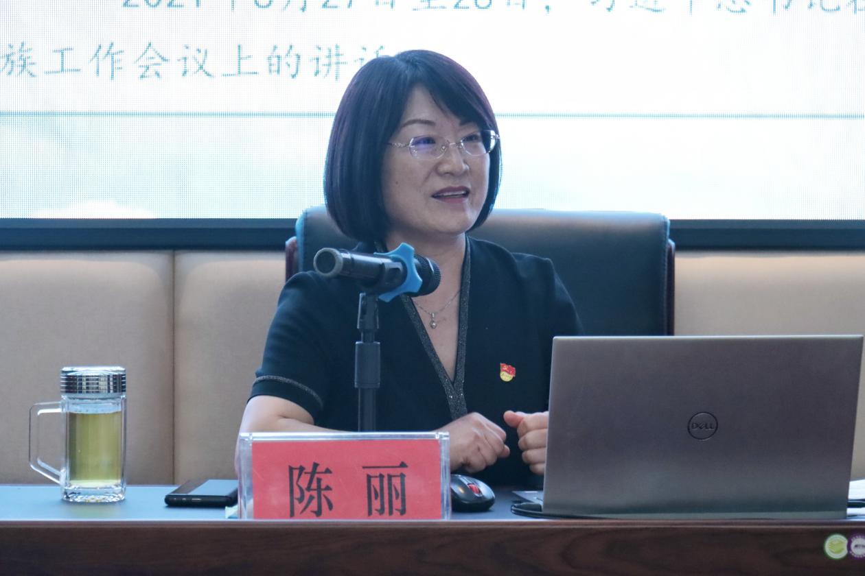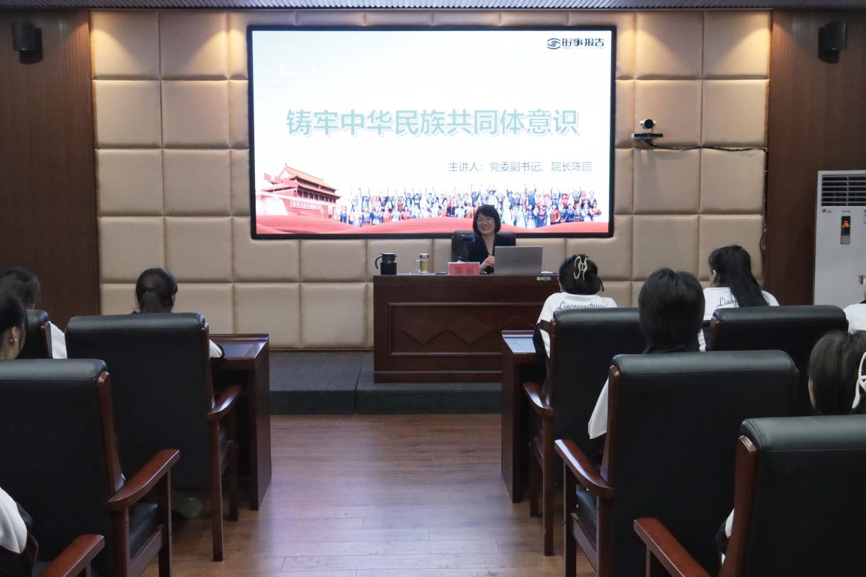 陈院长带领学生们回顾了中华民族共同体在历史长河中的形成和发展。她强调,中华民族共同体意识是国家统一之基、民族团结之本、精神力量之魂,铸牢中华民族共同体意识是维护各民族根本利益的必然要求。她结合我校少数民族工作和红石榴校园文化理念,从“铸牢中华民族共同体意识的战略意义”“把握中华民族共同体意识的丰富内涵”“铸牢中华民族共同体意识的实践路径”等三个方面,教育和引导同学们要不断推动“五个认同”“四个共同”“四个与共”“四对关系”内化于心、外化于行,以实干创实绩、以奋斗促富裕,共同推动中华民族“复兴号”巨轮扬帆起航。