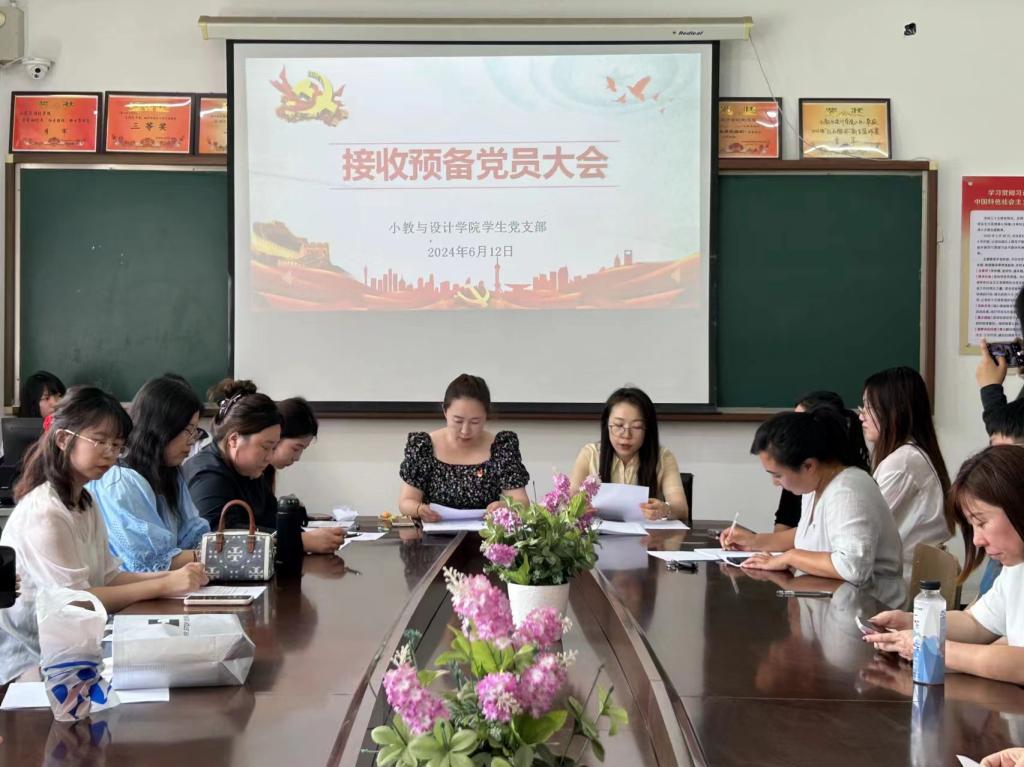 6月12日下午,小教与设计学院学生党支部在六号教学楼301召开预备党员接收大会,会议由学生党支部书记王潇潇主持,学生党支部全体党员及发展对象参加会议。