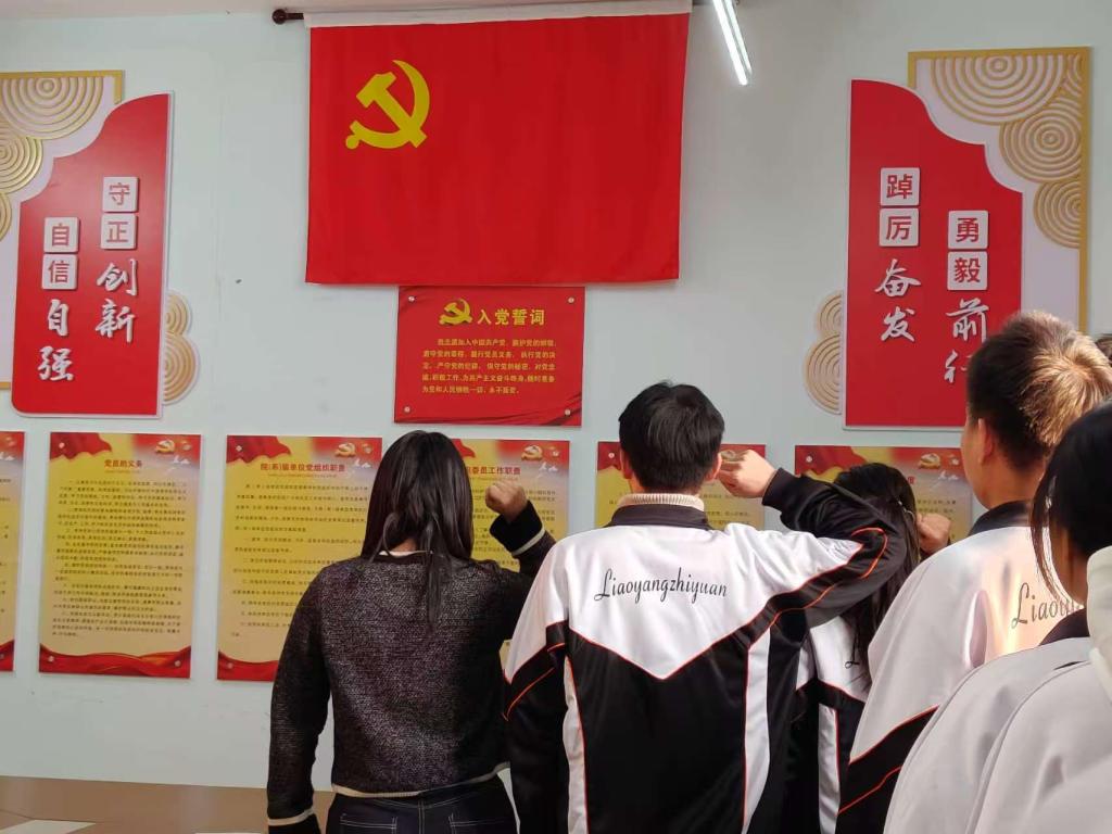 支部党员李玉婷和赵姝婷,在党旗下为以上5名中共预备党员佩戴党徽,并面向党旗庄严宣誓。