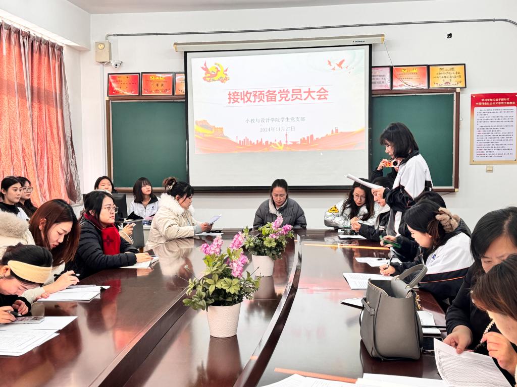 为扎实推进党员发展工作,进一步加强党的基层组织建设,凝聚新生力量,小教与设计学院学生党支部于11月27日在六号教学楼301会议室召开预备党员接收大会,会议讨论了王婷婷等3位发展对象的接收问题。本次会议由学生党支部书记王潇潇主持,支部全体师生党员参加会议。