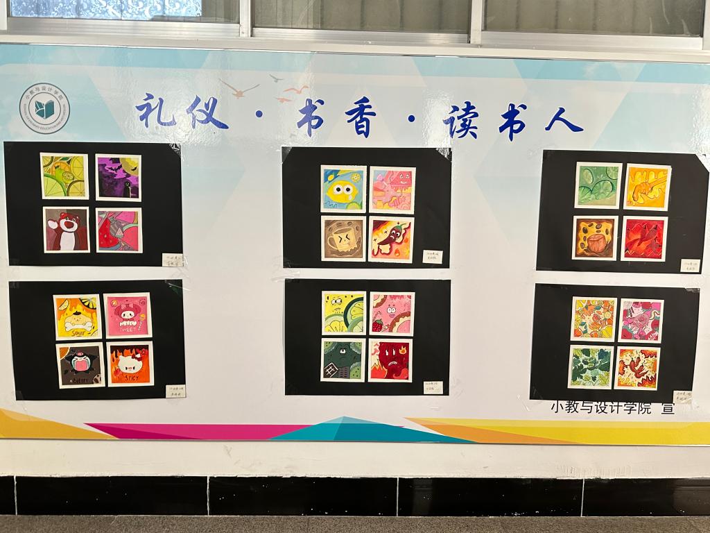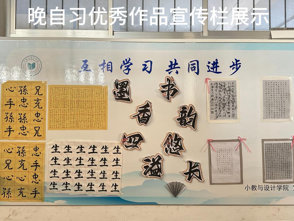 小教与设计学院的“特色晚自习”不仅丰富了学生们的课余生活,更为他们的专业学习和个人成长提供了有力的支持,也是小教与设计学院教学工作和学生工作深度融合的具体体现,为培养全面发展的高素质人才打下了坚实基础。此外,小教与设计学院通过宣传栏、宣传展板对优秀作品进行定期展示,以此营造更加浓厚的学习氛围。