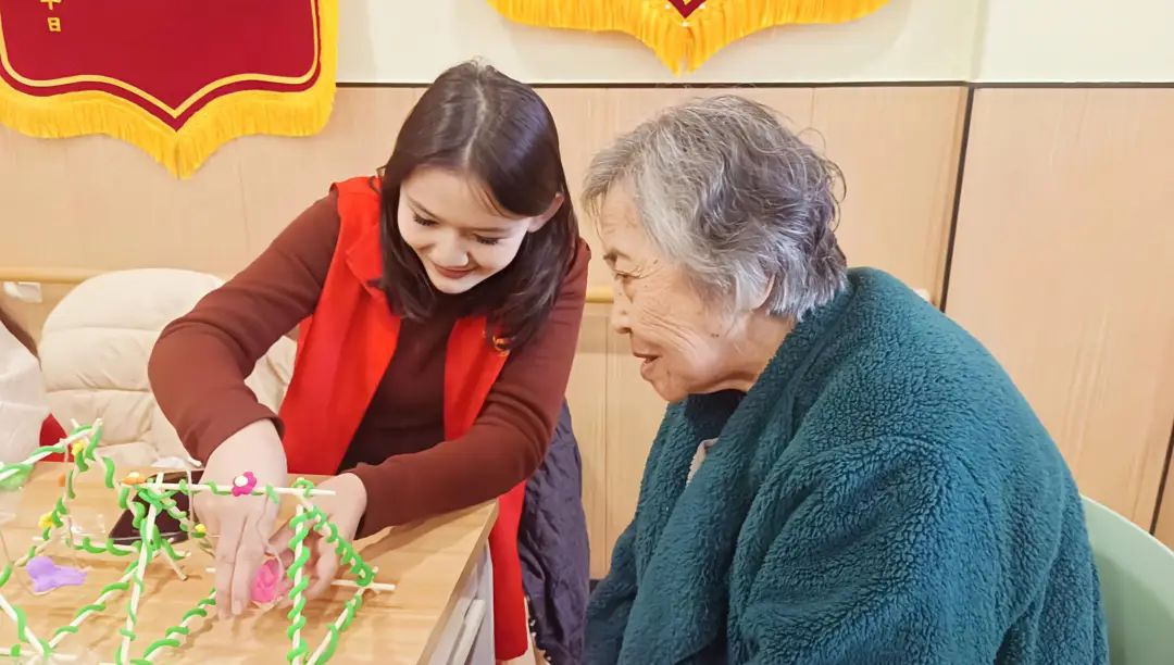 参观结束后,师生们围坐在老人们身旁,关切地询问他们的生活状况与身体情况,老人们也打开了话匣子,分享着过去的故事,从艰苦岁月的奋斗到平淡日子里的点滴温暖,师生们听得津津有味,现场气氛温馨融洽。聊天的过程中,师生们也渐渐加入了老人们正在进行的手工黏土制作的队伍中,只见桌上摆满了五颜六色的黏土、木质小秋千等材料。在制作过程中,师生与老人相互协作,遇到难题时,师生们耐心地为老人讲解;老人们也凭借丰富的生活经验,给出独到的建议,一位奶奶拿起黏土,熟练地捏出一个小巧的形状,说道:“孩子们,看,这样做个小装饰,贴上去会更有意思。”大家一边制作,一边分享着生活中的趣事,欢笑声、讨论声交织在一起,其乐融融。不一会儿,一件件精美的手工艺品便在众人手中诞生,有栩栩如生的蔬菜水果、花草树木,还有憨态可掬的黏土小动物,每一件都承载着师生与老人们共同的心血与情谊。最后,师生一行和老人们合影留念,并做好了下次一起做手工艺品的约定,活动在一片欢声笑语中落下了帷幕。