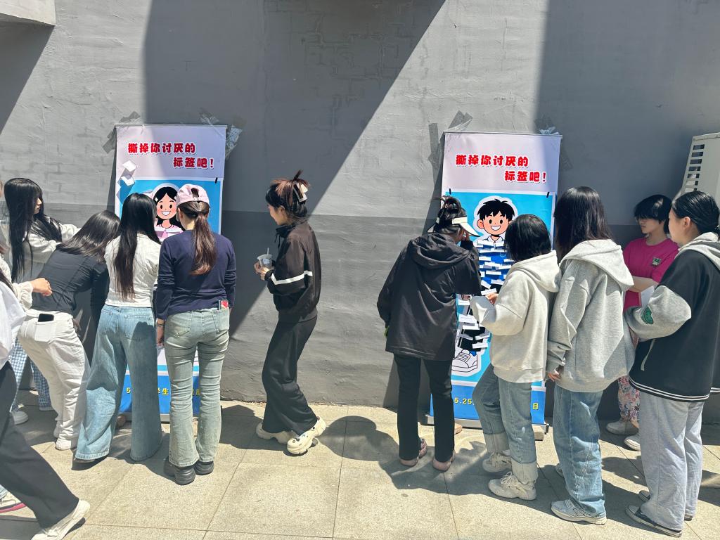 5 月 23 日中午,备受期待的 525 心理健康 “撕标签” 活动在校园内热烈开展。参加活动的有党总支书记刘鹤春、党总支副书记王潇潇及全体辅导员。活动现场设置了充满创意的男女人物立绘区域,立绘上贴满了诸如 “女生学不好数学”“男生不能脆弱” 等常见的刻板标签。同学们纷纷走上前,亲手撕下这些束缚自我的标签,用实际行动表达打破偏见、追求真实自我的决心。此外,活动还设置了寄语书写区,同学们领取便利贴后,认真写下对未来的美好期许,或是想对自己、他人说的温暖话语,并将其张贴在展示墙上,传递积极向上的正能量。在分享环节,部分同学主动走上舞台,分享自己撕标签的感受与心路历程,现场不时响起热烈的掌声,将活动氛围推向高潮。